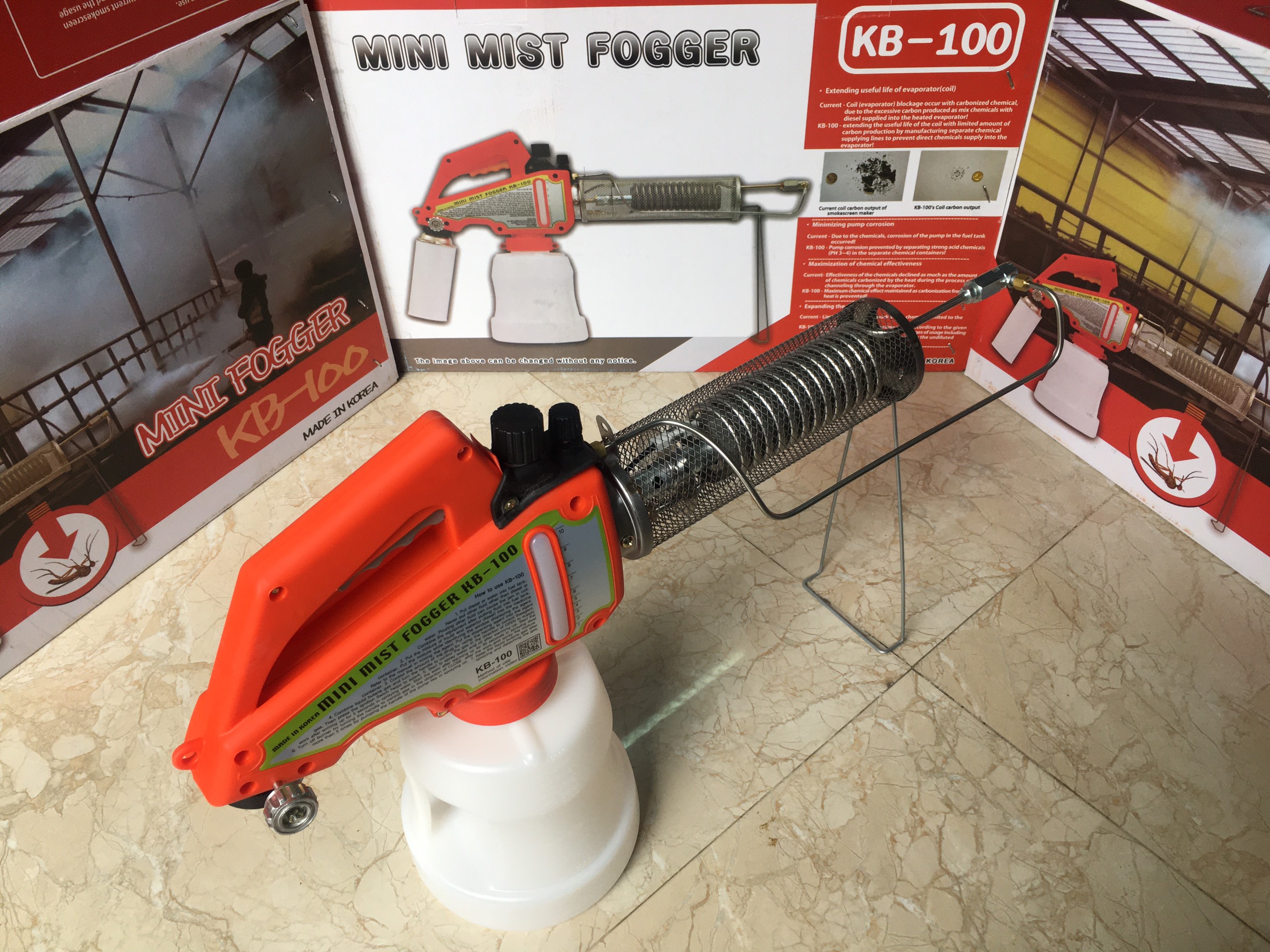 Máy phun khói Mini KB100 Min Mist Fogger sử dụng khí gas. Gas được đột cháy bởi hệ thống đánh lửa cơ khí và khí nóng trong một ống cuộn kim loại. Sử dụng cùng với dầu hoặc nước pha với hóa chất để tạo ra một màn sương mù hoặc khói mù. Nhờ tính linh động trong sản phẩm mà việc phun thuốc trừ sâu và chất khử trùng cho nhiều địa điểm tại nhà, nhà kho, công viên, chuồng gia súc, gia cầm và nhà kính có không gian vừa và nhỏ.