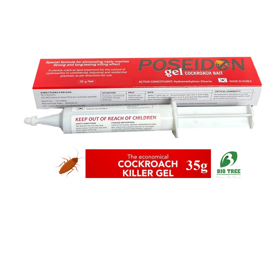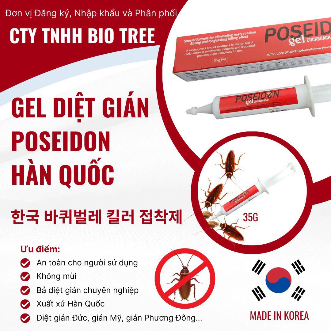 Gel diệt gián Poseidon Hàn Quốc chính hãng. Do Công ty Bio Tree nhập khẩu được Bộ Y tế cấp phép lưu hành, Gel diệt gián Poseidon Hàn Quốc an toàn sử dụng, hiệu quả kiểm soát tất cả các loại gián.