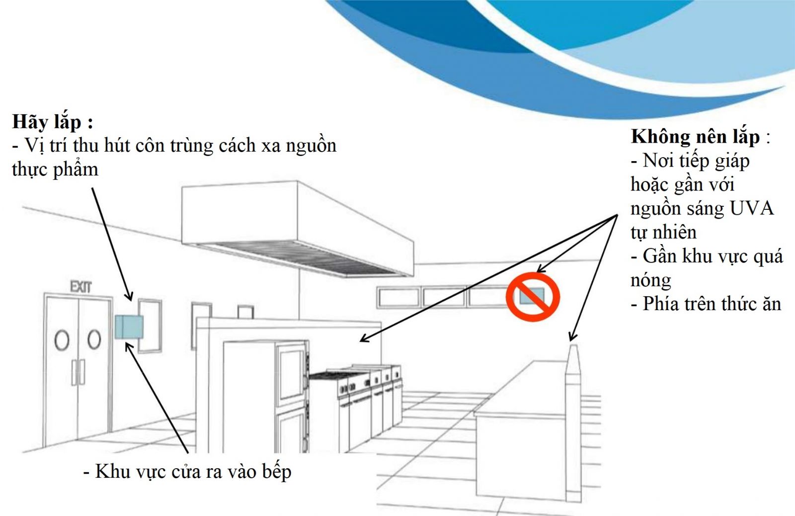 - Những lưu ý trước khi lắp đèn bẫy côn trùng là tuyệt đối không lắp đèn ở phía bên trên khu vực chế biến thực phẩm hay nước uống, đồ ăn.